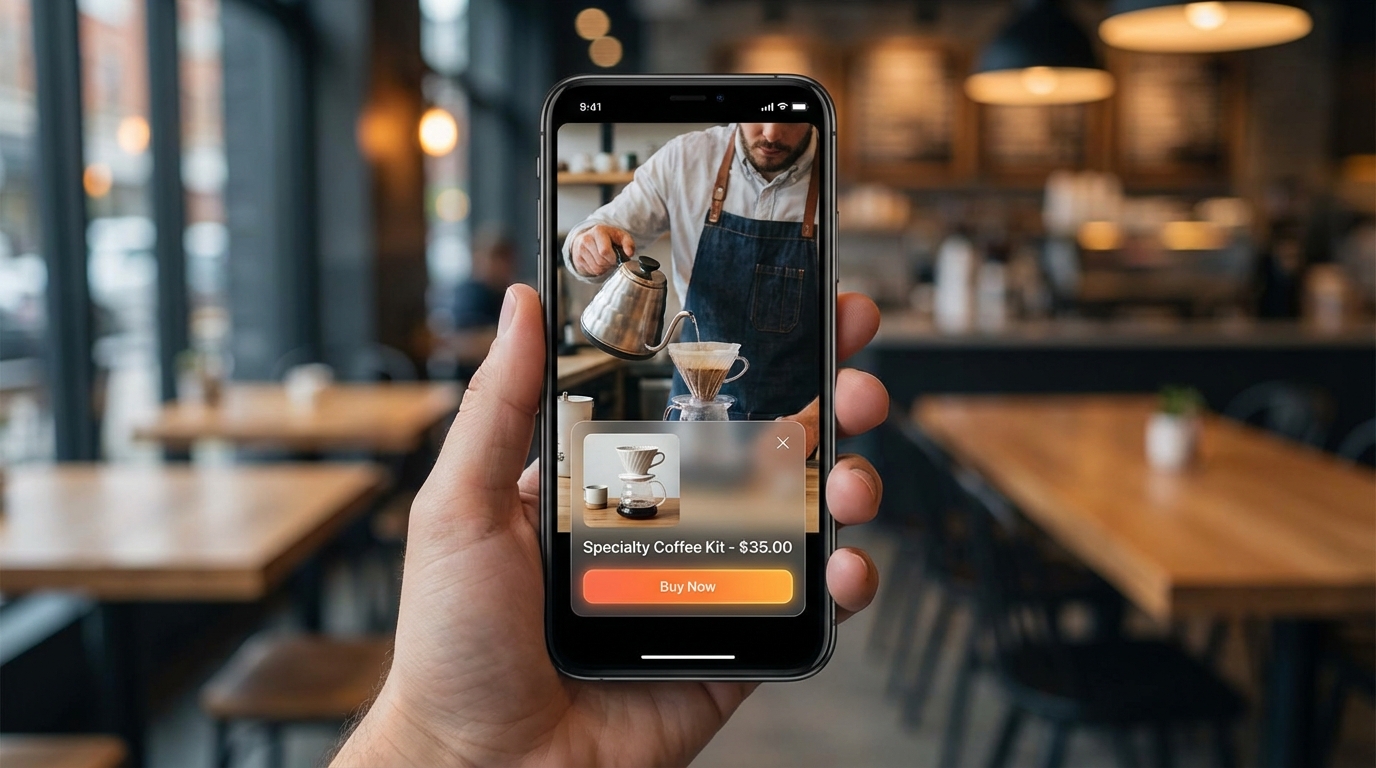 Vertical video, thumb-friendly checkout, one-tap purchase from the feed.